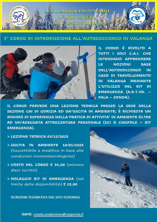 Nella locandina sono riportate le indicazioni del corso, per ulteriori info contattare gli organizzatori, scrivere a: scuola.scialpinismo@caigorizia.it