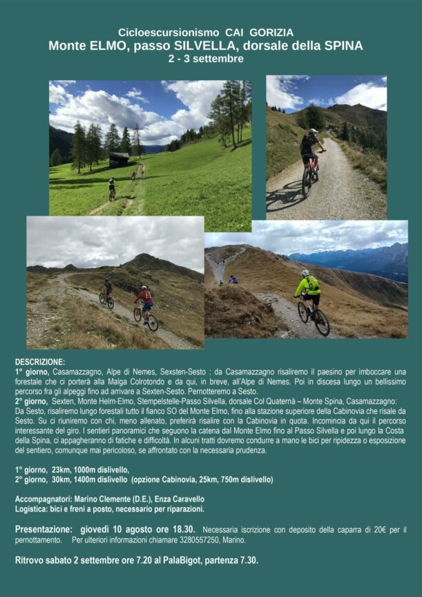 Il Gruppo di Cicloescursionismo organizza nei giorni 2 e 3 settembre una gita sulla dorsale del monte Elmo, passo Silvella, dorsale della Spina, a cavallo delle provincie di Belluno e Bolzano.