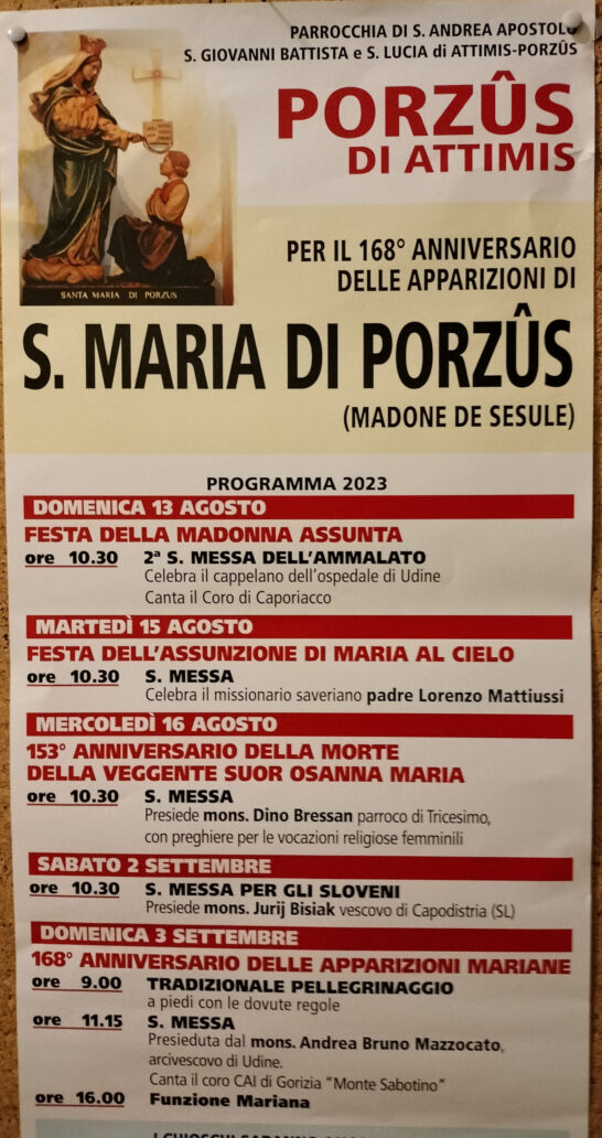 Il Coro “Monte Sabotino” sarà presente domenica 3 settembre a Porzus di Attimis, alla celebrazione della S.Messa delle ore 11.15 presieduta da Mons. Andrea Bruno Mazzocato.
