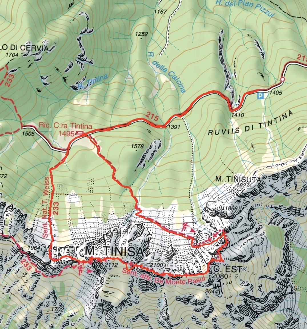 Itinerario: passo Pura (m. 1.425) – Casera Tintina (m.1.495) – sentiero attrezzato De Monte-Pascul – monte Tinisa (m.2.112) – sentiero Tiziana Weiss – Casera Tintina – passo Pura