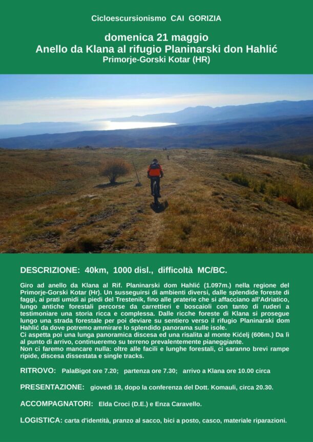 Viste le buone previsioni meteo, la gita di cicloescursionismo nel Gorski Kotar (HR) verrà recuperata domenica 21 maggio. Per ogni informazione sull’escursione (orari, difficoltà, dislivello, ecc.) consultare la sottostante locandina, oppure contattare il capogita Marino al n. 3280557250.