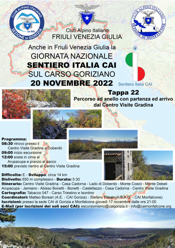 La Sezione di Gorizia, assieme alla Sezione di Monfalcone, organizza per domenica 20 novembre una gita sociale lungo il Sentiero Italia – tappa 22, sul Carso goriziano, con itinerario ad anello. Partenza ed arrivo dal Centro Visite Gradina.