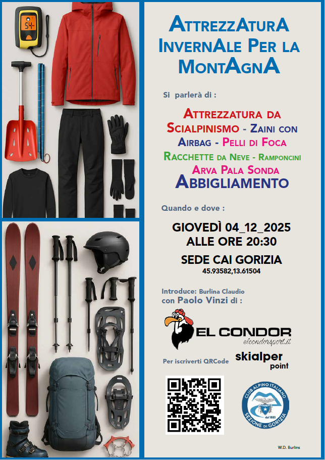 Serata aperta a tutti i soci e amanti della montagna in veste invernale 🏔, con lo staff del negozio El Condor Sport di Cormons, Skialper Point per la nostra zona, da sempre un punto di riferimento per l’attrezzatura invernale, con un fornitissimo negozio per tutti gli appassionati di montagna.
